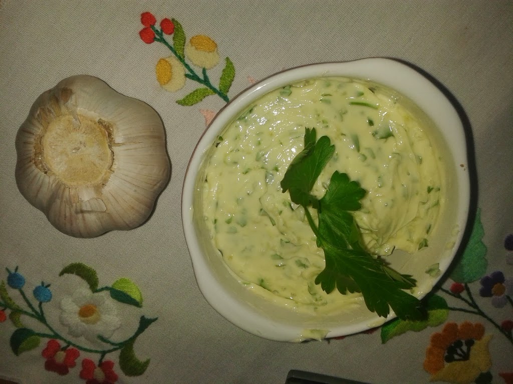 Előkészítettem a fűszervajat az esti vacsihoz, ami nem más mint 10 dkg vaj, 5 cikk fokhagyma összetőrve, kevés aprított petrezselyemzöld, só. Ezzel kenegetem meg a kenyér vagy kifli szeletkéket, megszórom reszelt sajjtal és a lerben ropogósra pirítom. Nagyon fincsi!!!