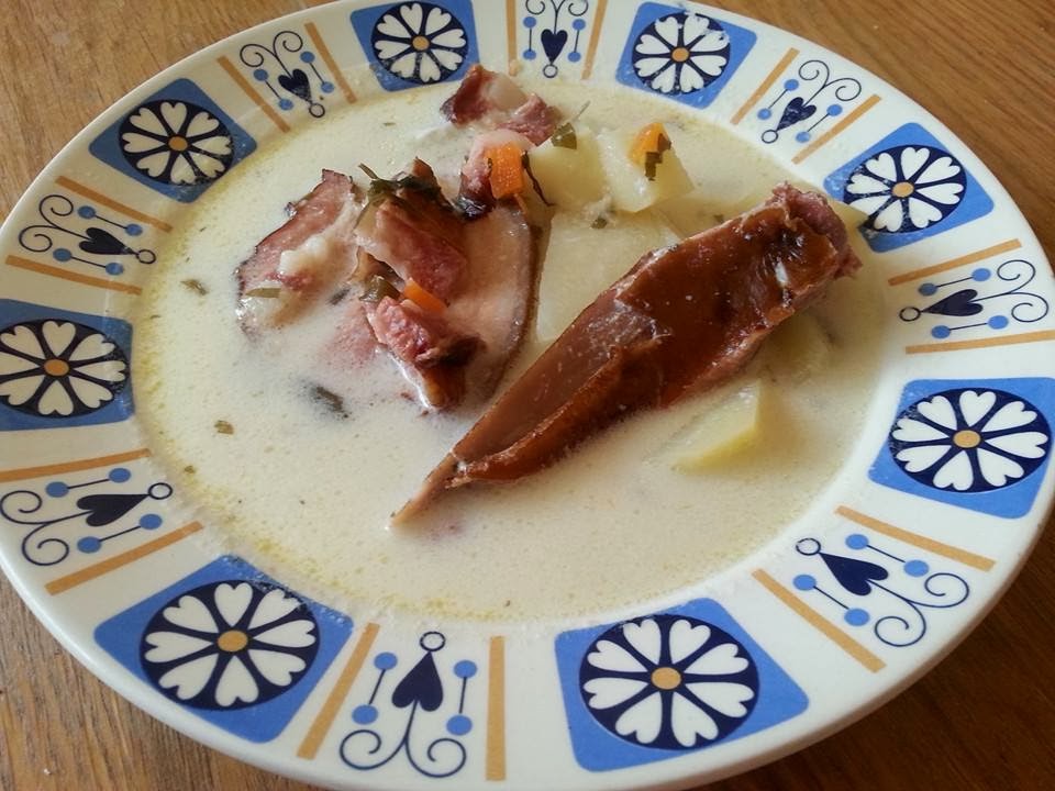 Ingredients: smoked ribs or bacon rashes, 6 bigger potatoes, 1 carrot, 1 parsley root, tarragon in vinegar (or fresh tarragon and vinegar), salt, sour cream, one egg, one white onion.