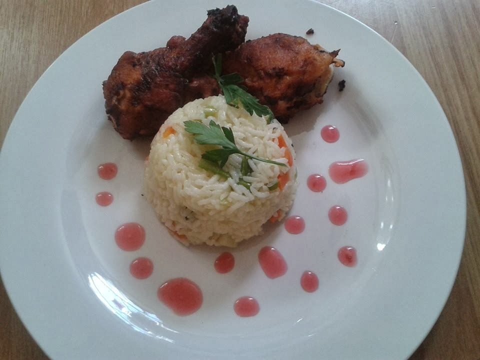 Kivettem a csirkecombokat, a rizsre helyeztem őket, és melegen tálaltam.